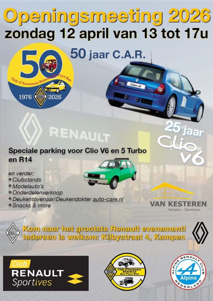 Bij Renault Van Kesteren in Kampen vindt zondag 12 april vanaf 13.00 uur de Openingsmeeting 2026 plaats